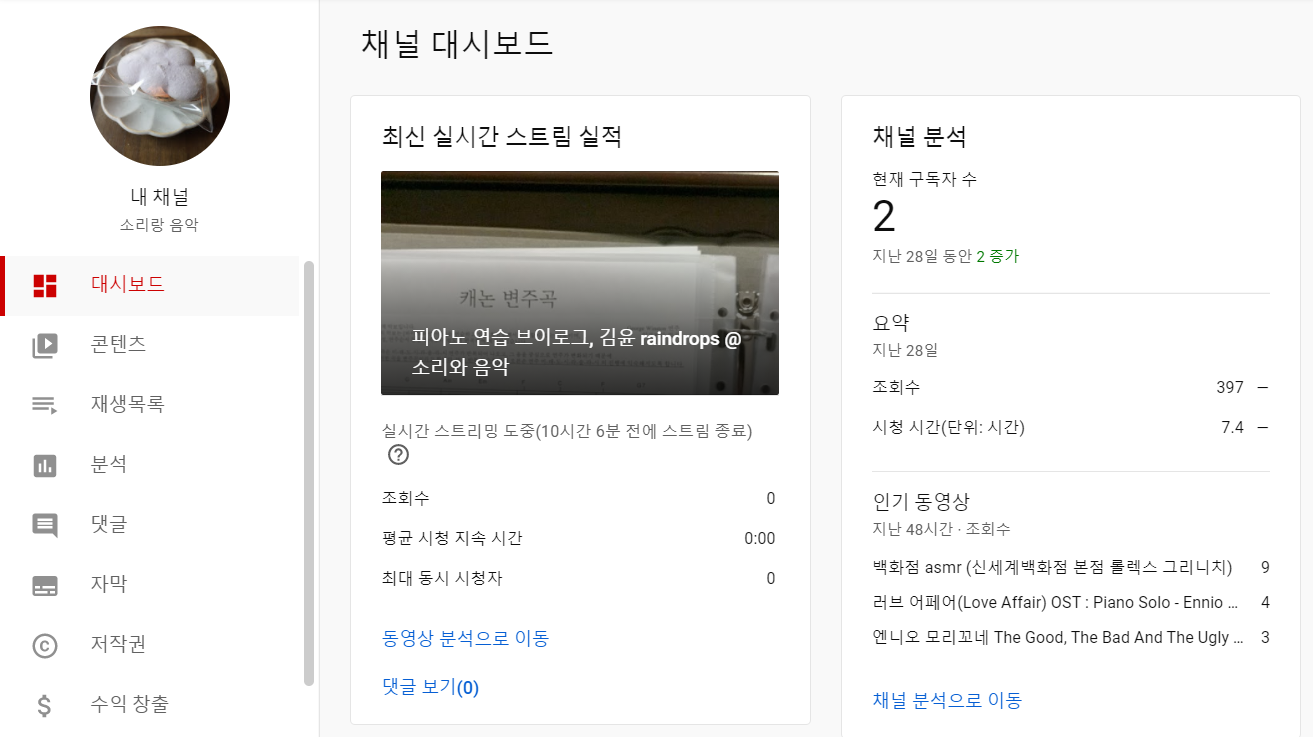 웃긴건 이 중에 칼림바 연주 동영상이 가장 조회수가 많더군요. 음악 유튜브는 예전부터 제가 해보고 싶었던 주제인데